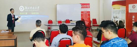 教育推介与专业培训由林肯大学学院副校长Kelvin Tong博士主持,我校田野博士以《开放的世界,与开大同行》为题,对湖北开放大学进行了专题推介,重点介绍了学校的办学理念以及软件技术、机电工程和人工智能等特色专业(群)建设情况,并基于学校传统的工科强项专业,以《如何用人工智能提升企业竞争力》为主题,为学生提供了针对性的培训课程。