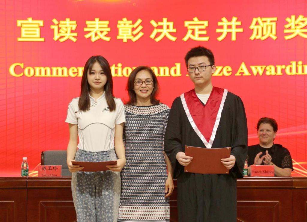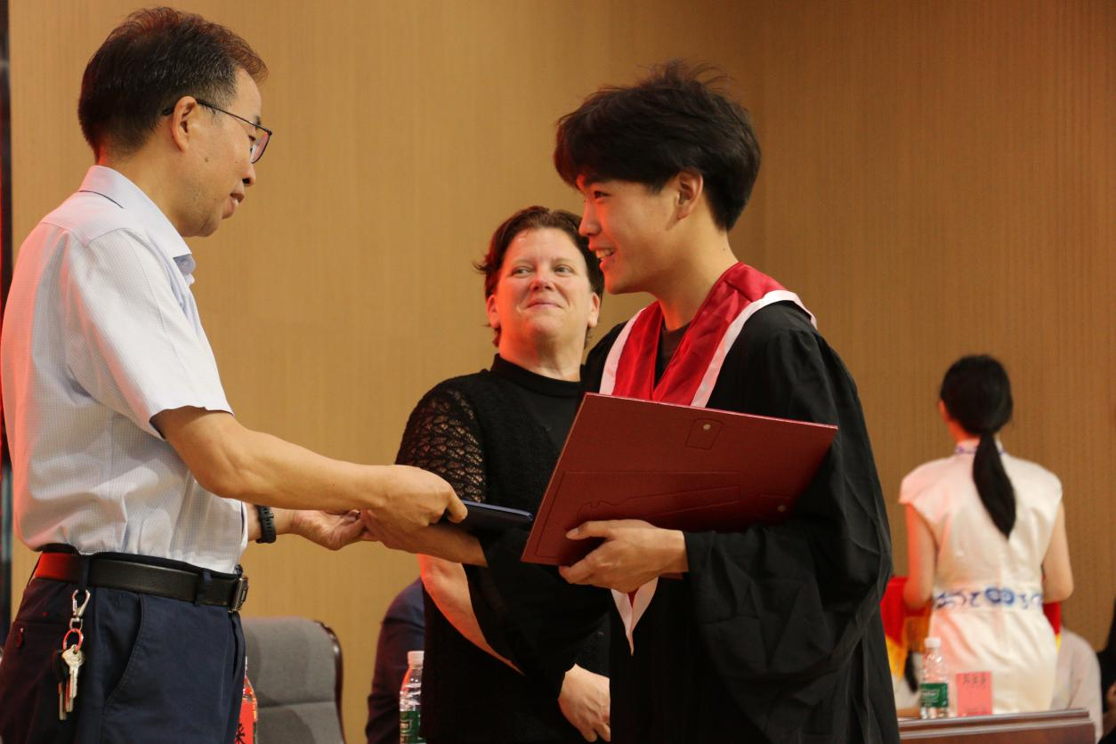 汤春来、Patricia Shields逐一为毕业生颁发毕业证书,并与同学们亲切握手合影,向他们表示热烈祝贺。