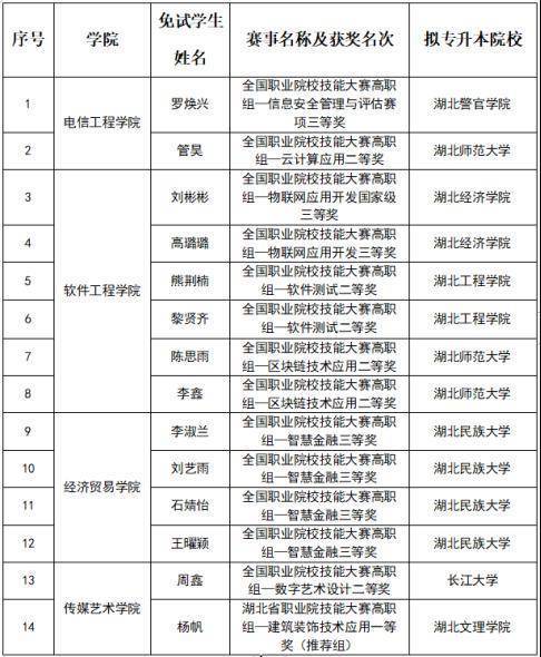 近日,湖北省教育厅发布《省教育厅关于做好2024年湖北省普通高等学校专升本工作的通知》。根据最新政策要求,经申报审核后,湖北科技职业学院2021级共14名优秀学子凭借出色的技能大赛成绩脱颖而出,荣获专升本免试资格,直接升入本科院校深造。