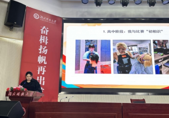怀揣美发梦想,在18岁那年,她报考了湖北科技职业学院传媒艺术学院人物形象设计专业。“来到湖科,学校除了提供技术指导,更在课程设置上让我对人物美感、整体造型有了更深地把握。”程亚林表示,是对专业的热爱,给了她拼搏的动力。大学期间,作为班级宣传委员的她,即使备赛再繁忙,班级事务也从来不落下,积极组织同学们参与各项文体活动,被班级同学推选为入党积极分子,荣获国家级、省级和市级的多项荣誉。学院开展的“领学计划”活动,程亚林作为第一期开讲人,以《虽是毫毛技艺,却是顶上功夫》为题,分享自己参加职业技能大赛的备赛经验、心路历程,并现场进行盘发技能展示,她的分享引发同学们的阵阵掌声。在现场技能展示环节,程亚林用头发做出一朵精美的玫瑰花造型,技艺精巧、灵动逼真,令在场的同学们惊叹不已。
