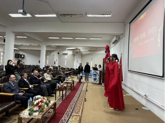 在苏伊士运河大学孔子学院,代表团拜访了孔子学院院长及中方院长,亲切慰问了孔子学院的师生代表,参观了郭沫若展厅、老舍纪念馆及京华夏安博物馆,详细了解了学院的办学情况以及近年来在汉语教学、文化传播和中埃教育合作方面取得的成果。代表团还受邀观摩了埃及中小学中文教师教学技能大赛,孔子学院的学生们为代表团献上了精心准备的节目,他们载歌载舞,用流利的中文表达了对中国客人的喜爱和欢迎。