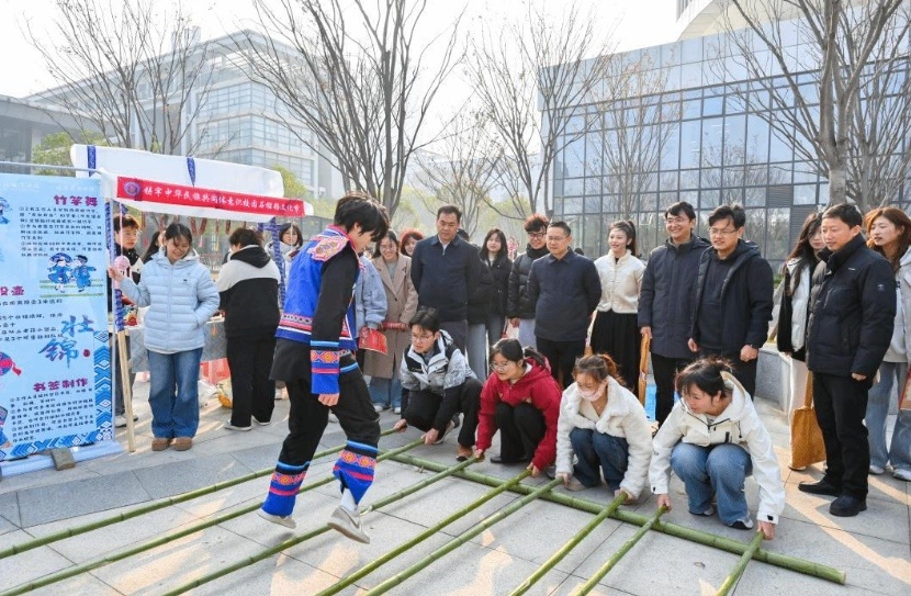 经济贸易学院的壮族文化展则充满互动乐趣,师生们在投壶区凝神屏气投掷箭矢,不时响起阵阵欢呼;随着“开合开合”的口令,同学们在竹竿舞体验区跟着节拍穿梭其中,充分感受壮族文化的活力。