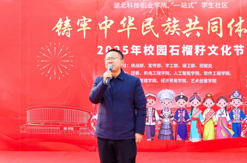 “太震撼了!我还是第一次见到有这么多同学自发排起长队参加一场校园活动,更没想到校领导会走进队伍和我们一起跳舞,是真正的一家人!”12月17日,湖北科技职业学院“铸牢中华民族共同体意识校园‘石榴籽’文化节”现场,方靖同学的话立即引起了周围同学的共鸣。随着《最炫民族风》的欢快旋律,党委副书记何平与身着各民族服饰的同学们手拉手共舞,不远处副校长周得力举着红彤彤的糖葫芦与学子亲切合影,温暖场景点燃全场热情,一场兼具视听盛宴与思政温度的文化盛会就此拉开帷幕。