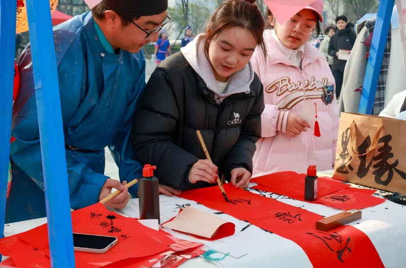 各学院文化展区已排起体验长队:东湖高新区法院团委在活动现场设置了普法宣传点,向师生普及民族政策和法律知识;校团委的冬至主题展暖意融融,包饺子、写春联年味十足。