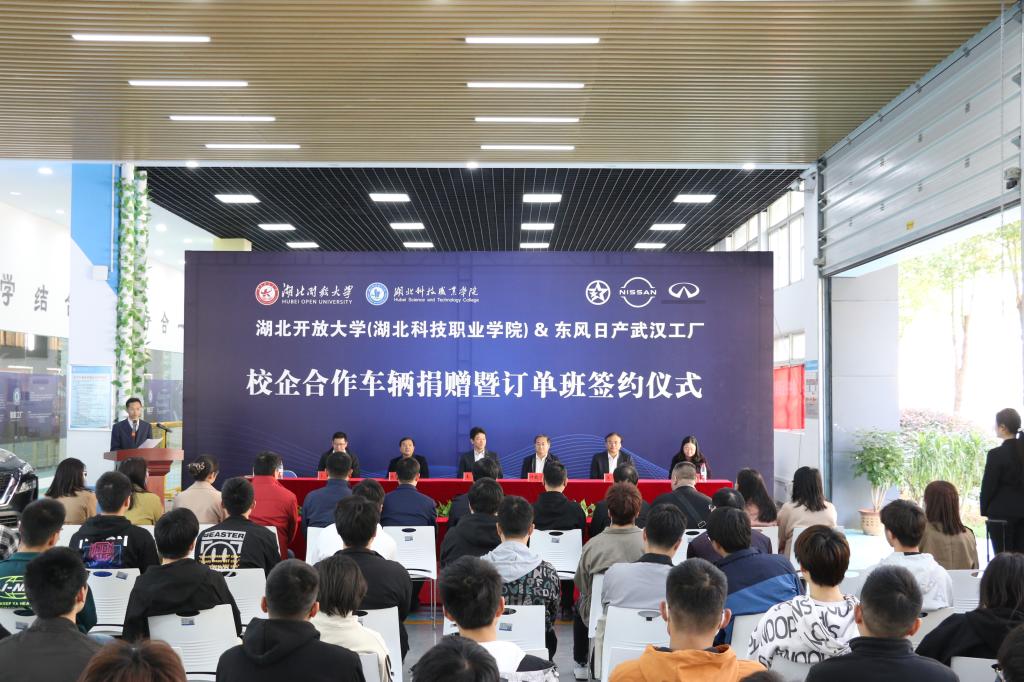 本网讯(通讯员 徐璐/文 毕小艳/图)3月12日上午,东风日产武汉工厂向学校捐赠汽车及东风订单班签约仪式在学校智能制造工厂举行。校长钟毓宁、副校长宋移安,东风有限(东风日产)党委书记王强以及双方相关部门负责人出席捐赠仪式,仪式由职院教务处、校企合作处处长夏学文主持。