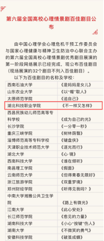 本网讯(通讯员 邹世康 文/图)5月30日,由中国心理学会危机干预工作委员会与国家心理健康与精神卫生防治中心联合主办的第六届全国高校心理情景剧优秀剧目展演公布获奖名单。我校原创心理情景剧《不一样又怎样》经网络展演、师生投票、专家评审,从全国各高校选送的近300个优秀剧目中脱颖而出,荣获本届全国高校心理情景剧大赛“百佳剧目”(第33名),此次我省有5所高校入选,我校是其中唯一的高职院校。
