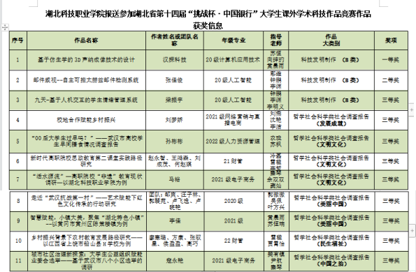 本网讯(通讯员 肖莉山/文 王典 黄晨雨/图)湖北省第十四届“挑战杯·中国银行”大学生课外学术科技作品竞赛落下帷幕。经过激烈角逐,我校选送的12项作品分别荣获一等奖1项、二等奖1项、三等奖9项,获奖数量和质量均创课外学术科技作品竞赛历史新高,获奖率超过90%。其中一等奖获奖项目《基于仿生学的3D声纳成像技术的设计》将代表湖北省参加全国决赛。