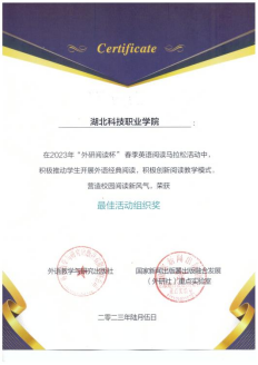 本网讯(通讯员 刘珍 文/图)6月9日,由外语教学与研究出版社联合国家新闻出版署出版融合发展(外研社)重点实验室大数据外语阅读研究基地主办,面向全国高职院校发起的2023年“外研阅读杯”春季英语阅读马拉松活动圆满结束。我校唐东升同学荣获全国二等奖,张易良、陈希文、吕旺祥同学荣获全国三等奖;我校凭借学生出色的有效阅读量被授予“最佳活动组织奖”。