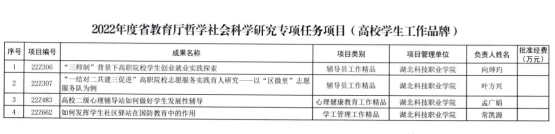 本网讯(通讯员 王维 文/图)近日,从湖北省教育厅获悉,在2022年湖北省教育厅哲学社会科学研究专项任务项目中,我校获批立项4项高校学生工作品牌项目和1项思想政治理论课项目。其中学生工作品牌项目立项数量为历年最高。