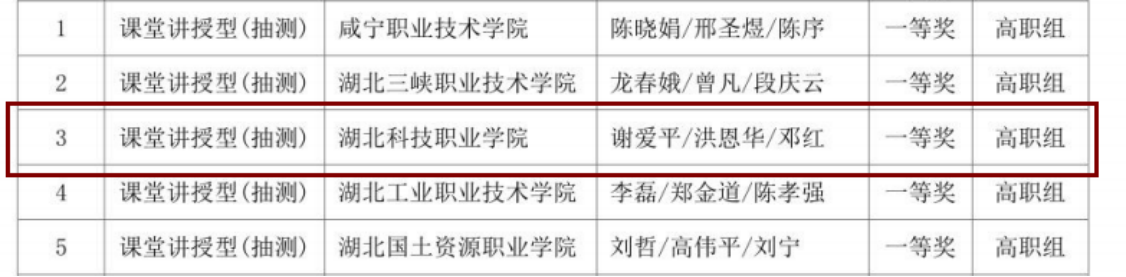 本次省赛共有425个教学团队,1285名教师参赛,共有59个教学团队获得一等奖,91个教学团队获得二等奖,136个教学团队获得三等奖。我校五支参赛团队全部获奖,获奖率达到100%,一等奖获奖率达到60%,是我校有史以来省赛最好成绩。
