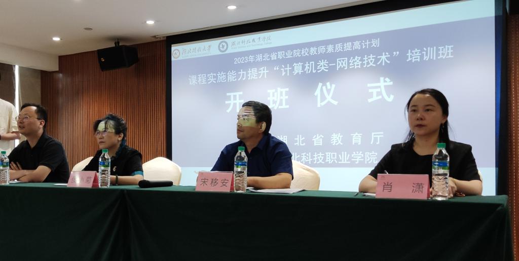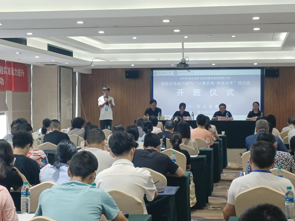 本网讯(通讯员 李主国 文/图)8月14日上午,由湖北省教育厅主办,我校承办的2023年湖北省职业院校教师素质提高计划课程实施能力提升“计算机类-网络技术”培训班,在我校电信工程学院开班。中国教育技术协会副秘书长侯小菊博士,校党委常委、副校长宋移安出席开班仪式,电信工程学院、培训学院领导班子成员,以及来自全省80名中职、高职院校专业骨干教师参加开班仪式。