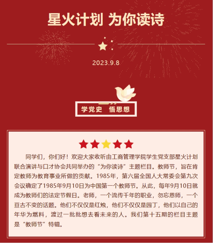 工商管理学院“星火计划”学生党建工作室在教师节推出“为你读诗”之教师节特辑