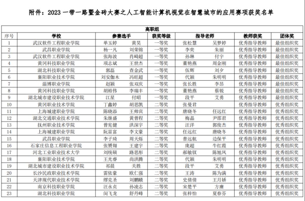 本网讯(通讯员 张梓怡 伍辉/文 夏春芬/图)11月11日至12日,2023“一带一路”暨金砖国家技能发展与技术创新大赛之人工智能计算机视觉在智慧城市的应用赛项在武昌职业学院开赛。我校电信工程学院人工智能技术应用专业的2支参赛队与全国90支队伍同台竞技,经过激烈的比拼,郭磊、查金武团队获一等奖,闵飞龙、舒丹峰团队获二等奖,学校获最佳组织奖,伍辉、刘夕、夏春芬、张梓怡获优秀指导教师称号,全员载誉而归。