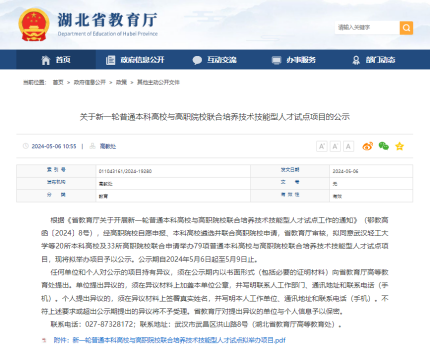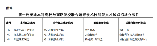 本网讯(通讯员 詹乐/文 卢义平/图)近日,湖北省教育厅公示了新一轮普通本科高校与高职院校联合培养技术技能型人才试点项目名单,我校软件技术、大数据技术、机械设计与制造三个专业成功入选。我校将与湖北汽车工业学院、湖北第二师范学院、荆楚理工学院三所优秀的公办普通本科高校开展深度合作,共同推进技术技能型人才的培养。
