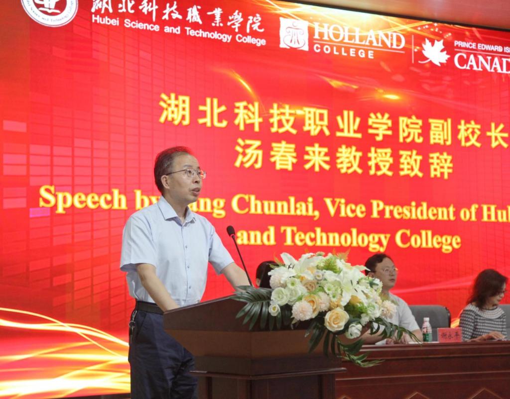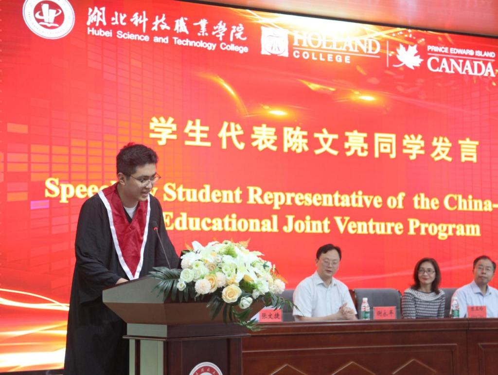 Patricia Shields在致辞中对我校领导及全体教职工在中加合作办学项目中的辛勤付出致以诚挚的谢意,对同学们从荷兰学院与湖北科技职业学院两所院校同时顺利毕业表示衷心的祝贺,向我校在与荷兰学院合作办学方面所表现出来的远见卓识和非凡勇气致以敬意。同时,她鼓励毕业生们勇于追寻自己的梦想,热切期待两校在未来建立更紧密、深入的合作关系。