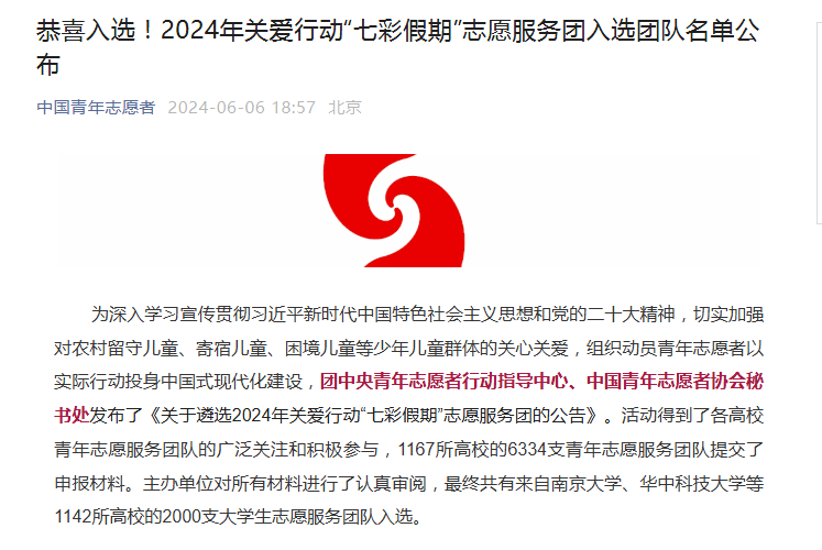 本网讯(通讯员 金垒 肖莉山 文/图)6月6日,团中央青年志愿者行动指导中心、中国志愿者协会秘书处发布2024年关爱行动“七彩假期”志愿服务团入选名单,软件工程学院克勤志愿服务队暑期社会实践团队成功入选。