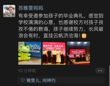 经济贸易学院2024届金融科技应用专业石婧怡妈妈作为家长代表进行了热情洋溢地发言,她以一名母亲的独特视角,深情讲述孩子成长过程中的付出与收获,感谢学校、老师的悉心教导,并祝福同学们越来越好。讲到动情处数次哽咽,语言质朴,感情真挚,令人动容。