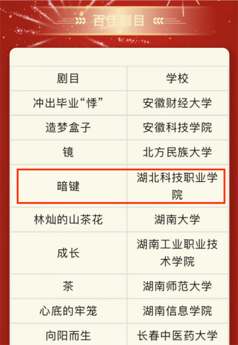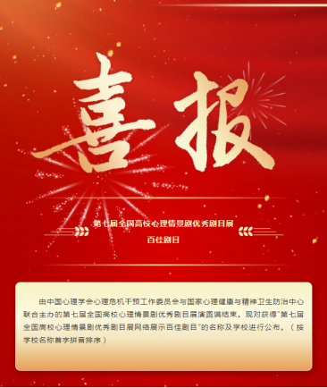 本网讯(通讯员 张启迪 黄海兰 文/图)6月13日,由中国心理学会危机干预工作委员会与国家心理健康与精神卫生防治中心联合主办的第七届全国高校心理情景剧优秀剧目展演公布获奖名单。我校原创心理情景剧《暗键》经网络展演、师生投票、专家评审,从北京大学、华中科技大学等全国近400所高校遴选的优秀剧目中脱颖而出,荣获本届全国高校心理情景剧大赛“百佳剧目”,我校优秀剧目已连续3年入围“百佳剧目”。