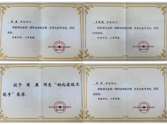 2023年周燕和许华两位老师参加了由湖北省人力资源和社会保障厅主办的第一届全国职业技能大赛计算机软件测试赛项。该赛项对标世赛、国赛标准,设置为个人赛,两位教师首次参加教师赛分别荣获第三名和第五名的优异成绩。经赛项主办方组织申报,湖北省人社厅近日颁发了荣誉证书。