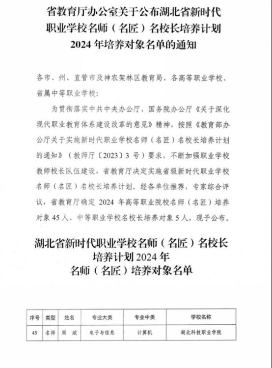 本网讯(通讯员 高杨舒 文/图)近日,湖北省教育厅公布湖北省新时代职业学校名师(名匠)名校长培养计划2024年培养对象名单,我校电信工程学院周斌教授成功入选名师培养对象。