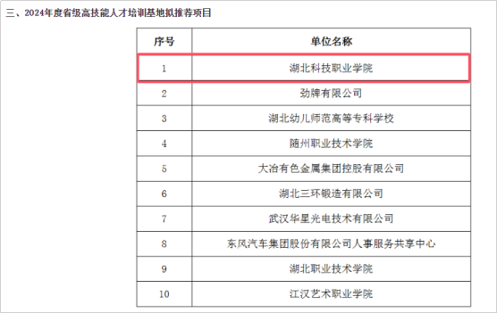 本网讯(通讯员 谭芬 文/图)根据湖北省人力资源和社会保障厅《关于2024年度国家级、省级高技能人才培训基地和技能大师工作室建设项目拟推荐名单的公示》,我校以排名第一的成绩高质量通过省级高技能人才培训基地评审。
