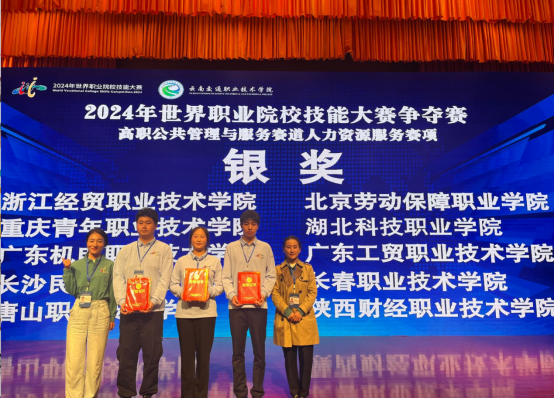 本网讯(通讯员 农珑 杨晶/文 杨晶 汪子琪/图)10月25日至27日, 2024年世界职业院校技能大赛争夺赛公共管理与服务赛道“人力资源服务”赛项在云南交通职业技术学院举办。来自全国30个省、自治区、直辖市的58支队伍219名选手参加比赛,经过两天的激烈角逐,我校工商管理学院教师杨晶、张姝指导的人力资源管理专业的学生团队孙彬彬、黄海源、李靖凭借出色的表现荣获银奖。