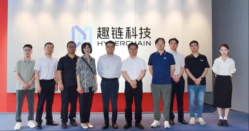 陈志祥一行在杭州趣链科技有限公司副总裁匡立中带领下参观了趣链产业园,匡立中介绍,公司自2016年成立以来牵头和参与了50 余项国家重点研发计划及省部级项目,并展示了公司利用区块链技术在金融、能源、医疗、农业、双碳等高需求高频率领域数据协同的应用成果。