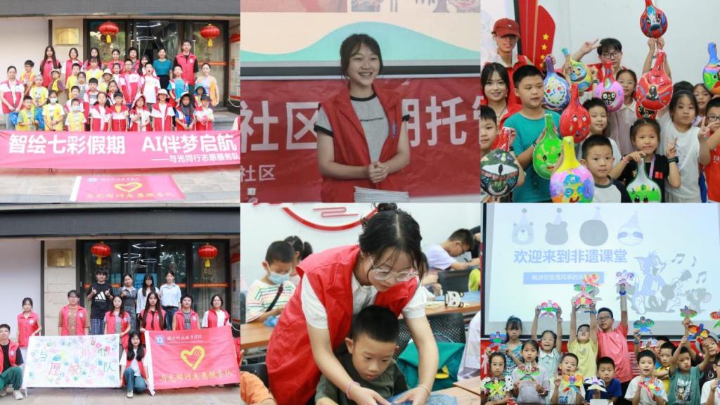 艺术创意学院:非遗传习进社区,传统文化润童心。2025年7月7日, “区微里”大学生志愿服务队22名师生前往武汉市洪山区卓刀泉街道鲁广社区开展七彩假期非遗体验周暨爱心托管活动。期间,志愿服务队将在校所学的非遗技艺与社会实践相结合,在社区开设非遗趣工坊,讲解武汉剪纸、手工螺钿、扎染、脸谱制作、传统泥塑、手工团扇等非遗技艺的历史和发展,并进行现场教学,小朋友们在玩转非遗中体会和感悟非遗技艺和优秀传统文化之美,让文化滋润童心,进一步激发了非遗文化的活力与生命力;举办爱心托管班,为社区的小朋友们开设课业辅导、安全知识小科普、动画电影赏析等课程,帮助小朋友们度过充实和快乐的暑假。