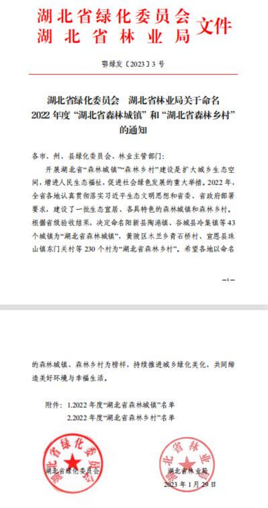 本网讯(通讯员 郭兵/文 孙通/图)1月29日,湖北省绿化委员会、湖北省林业局印发了《关于命名2022 年度“湖北省森林城镇”和“湖北省森林乡村”的通知》,我校帮扶村利川市毛坝镇五二村成功入选2022年度“湖北省森林乡村”。