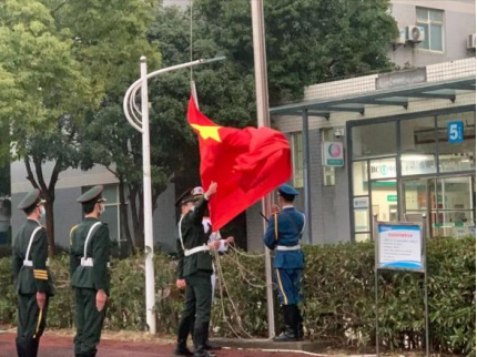 上午7点整,足球场前庄严肃穆,伴随着激昂雄壮的《义勇军进行曲》,鲜艳的五星红旗冉冉升起,全校师生面向国旗共同迎接新学期的到来。