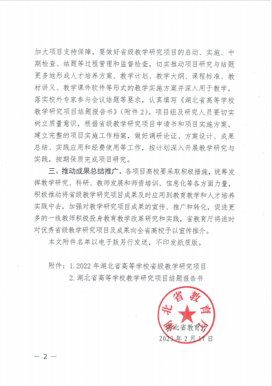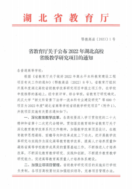 本网讯(通讯员 詹乐 文/图)2月11日,省教育厅公布了2022年度湖北省教学研究项目名单,我校推荐申报的2022年湖北高校省级教学研究项目获批立项2项:机电工程学院教师付强《高职石油工程专业课程思政教学实践与创新路径研究》、工商管理学院教师李智《“乡村振兴”背景下湖北高职院校专业结构优化调整的路径与策略》。