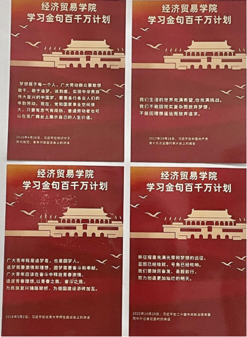 本网讯(通讯员 李哲/文 杨斌凯 刘祯舜/图)习近平总书记指出:“学习理论最有效的办法是读原著、学原文、悟原理,强读强记,常学常新”。为深入学习贯彻习近平新时代中国特色社会主义思想,以思想引领助力学生成长成才,本学期经济贸易学院启动了“学习金句百千万计划”。