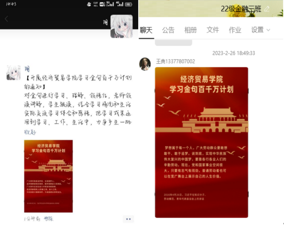 学院还将金句卡片推送至班级群,很多学生在学习以后纷纷发布微信朋友圈,进一步扩大了金句学习的影响和范围。