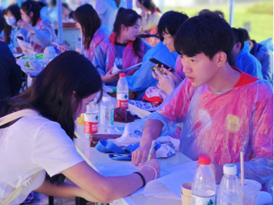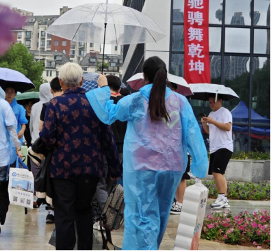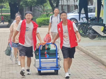 接过行囊,就是“一家人”。学院志愿者从新生们手中接过行囊,引导新生前往迎新点报到并且把行李贴心送到寝室。宿舍楼值班室设立“党员服务站”,新生从进入大门、一直到入住寝室,享受全程一对一服务。迎新当日突然下大雨,雨水给迎新工作带来很多困难,但所有志愿者坚守岗位、热情依旧。