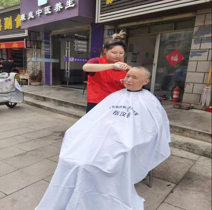 一张椅子、一个剃发推、一个简易的蒙布、一个喷壶……“临时理发店”就这么开业了,在姜凌霄与程亚林的“操刀”下,随着推子、剪子的上下翻飞,不一会儿,前来理发的居民面貌就焕然一新。在历经3个小时的辛勤劳动,他们为40余名群众提供了便民服务。程亚林说:“很荣幸做为省级美发技能大师工作室中一员,参与此次活动,用自己学所,为居民提供服务,这种感觉太棒了”。