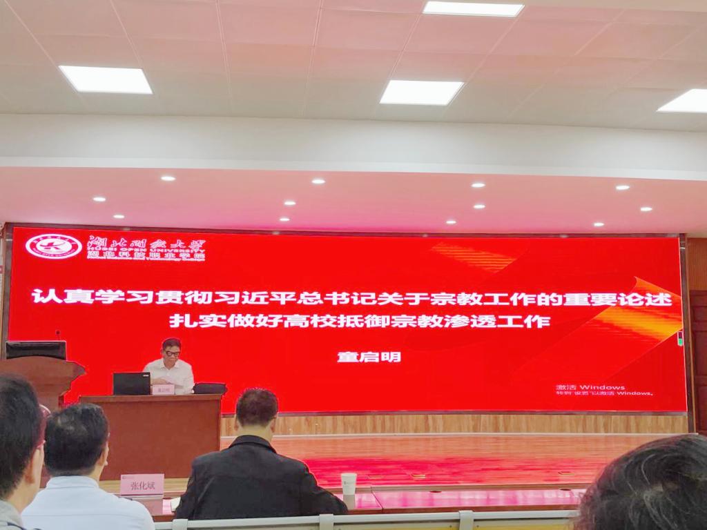 童启明以《认真学习贯彻习近平总书记关于宗教工作的重要论述扎实做好高校抵御宗教渗透工作》为题,用“新判断”“新阐述”“新任务”三个层面学习传达全国宗教工作会议精神,同时,从政策法规、工作方式、工作机制、关系处理四个维度进行了深入分析,用理论与实践相结合的方式为做好新时代高校宗教工作提供了全面的指导和建议。