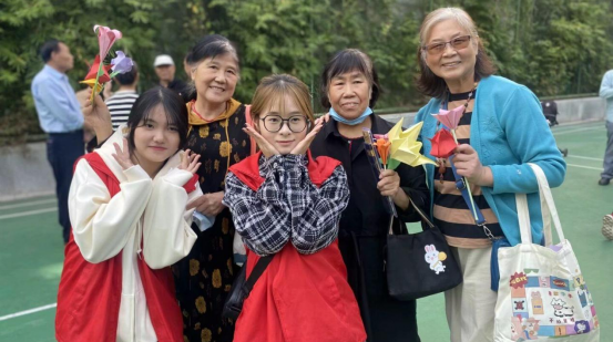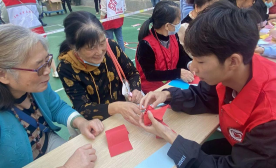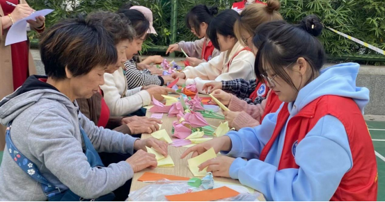 10月23日上午,经济贸易学院“头雁”志愿服务队进社区开展重阳节主题户外游园活动。在社区工作人员的协助下,志愿者们开展了手工、套圈、沙包等趣味项目,当志愿者们提前准备了手工纸花送给社区老人,很快吸引了居民一同加入手工学习活动。