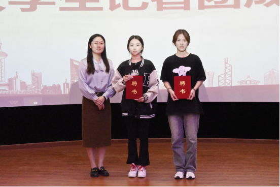 在会上肖莉山为记者团成员代表颁发了记者证和工作服,谢萍和王维分别为记者团成员代表颁发聘书。
