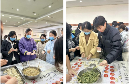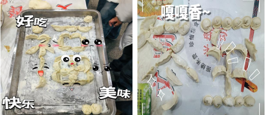 当天下午4点,师生们便齐聚活动场地,忙碌起来。擀饺子皮、和肉馅、包饺子,大家分工协作、有条不紊。经过一个多小时的共同努力,一排排饺子出现在桌盘上,有精致小巧的柳叶饺、有硕大饱满的东北饺、有标致圆润的元宝饺,甚至还有胖乎乎的小包子,场面甚是热闹。