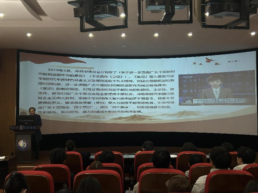 会上吕恒喜为学生干部作了主题为《做有担当精神的学生干部》的辅导报告。他从“党员干部应有怎样的担当”这一主题入手,从宏观到微观,通过“飞夺泸定桥”“飞兵清风店”等革命故事看共产党人的担当与拼博精神,勉励广大学生干部要心怀责任、勇于担当、以身作则、甘于奉献,教导学子们要遵纪守法、廉洁自律、加强学习、增强本领、率先垂范、实干苦干,向革命先辈们学习,从实际行动中落实责任担当。