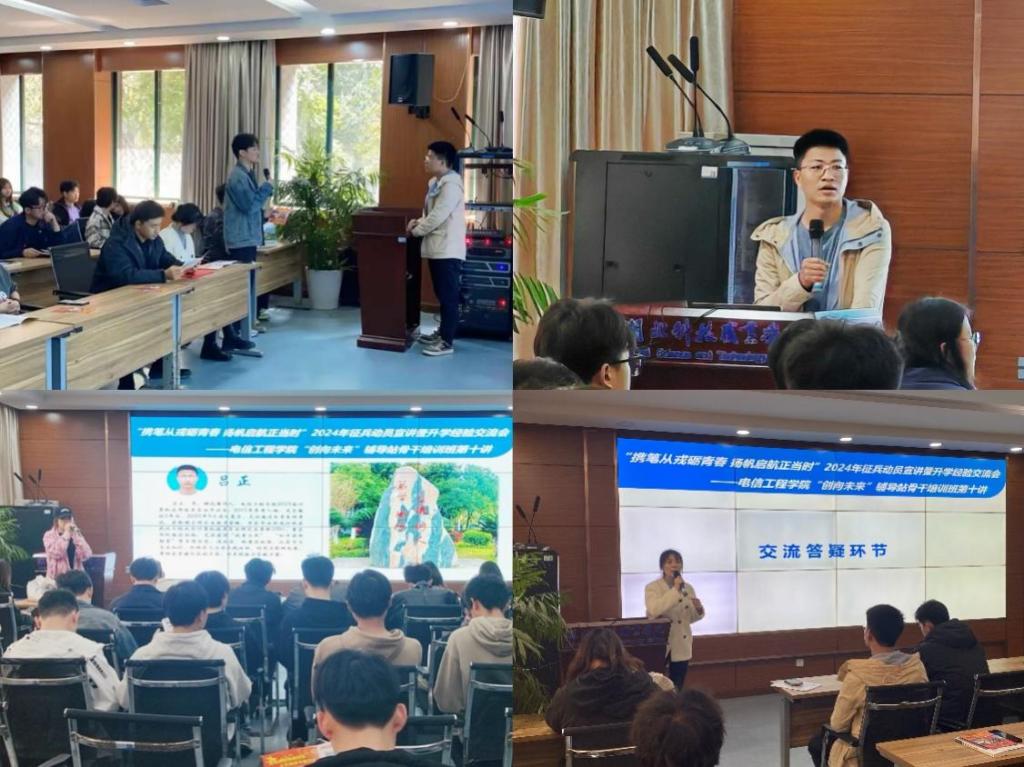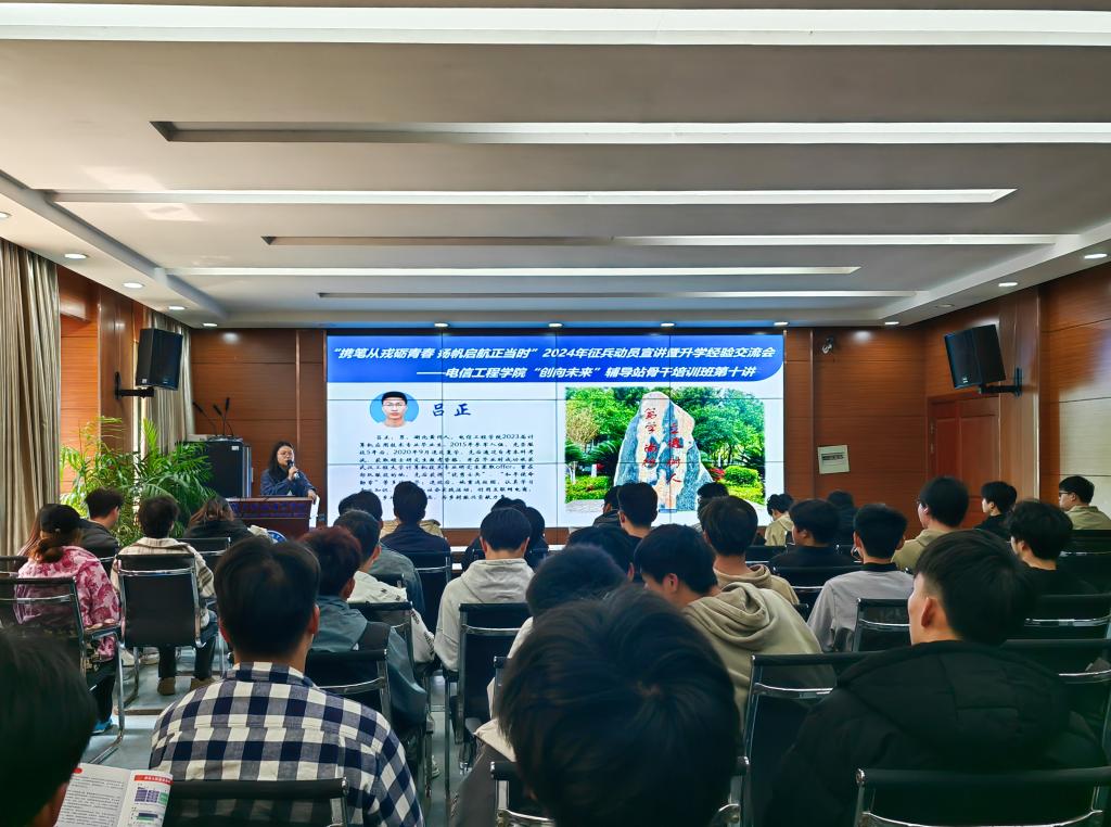 本网讯(通讯员 刘洵 向珅玓/文 大学生记者:李大为 张舒凯 曹礼成 蔡迪嘉恒/图)为进一步促进毕业生高质量就业,积极响应国家征兵工作号召,点燃学生参军热情,3月15日中午,电信工程学院举办“创向未来”辅导站骨干培训班第十讲——2024年征兵动员宣讲暨升学经验交流会,邀请我校2023届计算机应用技术专业毕业生吕正同学担任主讲嘉宾。