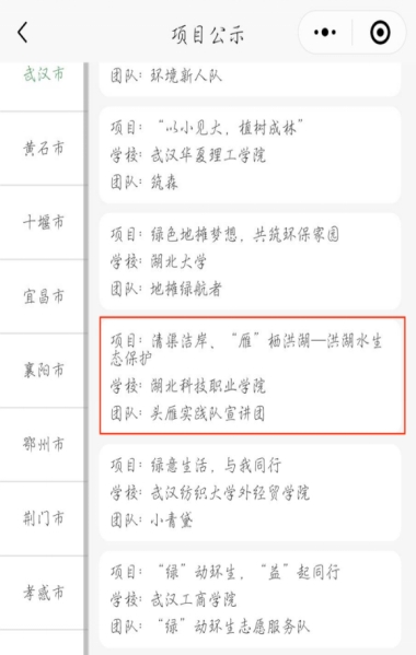 学院鼓励学生报名参加由湖北省生态环境厅举办的“与绿同行”微公益环保创意大赛,引导青年志愿者积极参与生态环境志愿服务实践,助力美好生态环境共同缔造。团队围绕神农架生物多样性保护和洪湖水域保护主题,分别申报了科普宣教公益项目,方案已经入围并正在公示中。团队拟结合社会实践开展相关科普宣教活动,做好环保志愿服务项目,让青春在志愿服务中绽放绚丽之花。