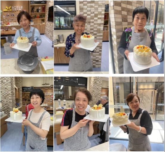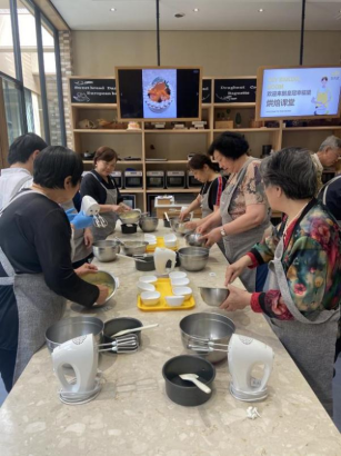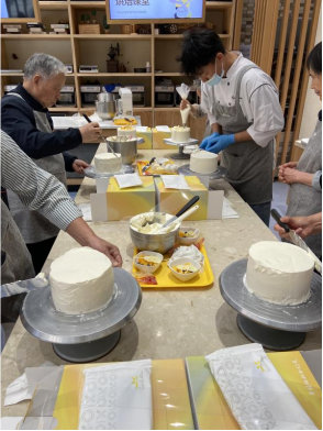 在皇冠幸福里梦工厂,烘焙老师采用知识解说与实际操作相结合的方式,一边细心讲解制作方法,一边现场操作,大家认真聆听,互动交流。在工作人员的指导下,大家纷纷动手操作,完成了蛋糕坯夹层制作、蛋糕坯抹面封顶、奶油和水果装饰等流程,活动室里弥漫着轻松而温馨的氛围。
