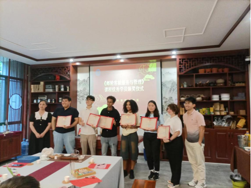 这批留学生也是我校省级精品课程《邮轮客舱服务与管理》的国际学员,茶话会后,学院为他们颁发了课程优秀学员证书,感谢他们对我校省级精品课程国际化认证做出的贡献。