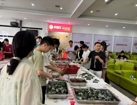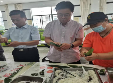 在关山校区食堂三楼,后勤服务集团党政主要负责人与各学院教师(含外籍老师)和毕业生代表一起填糯米、放蜜枣、裹粽叶、系马莲,同场竞技,各显身手,体验传统习俗,品味端午文化,共叙师生情谊,共迎端午佳节。
