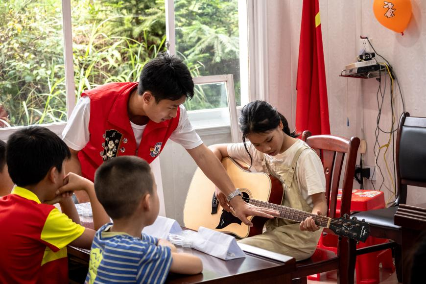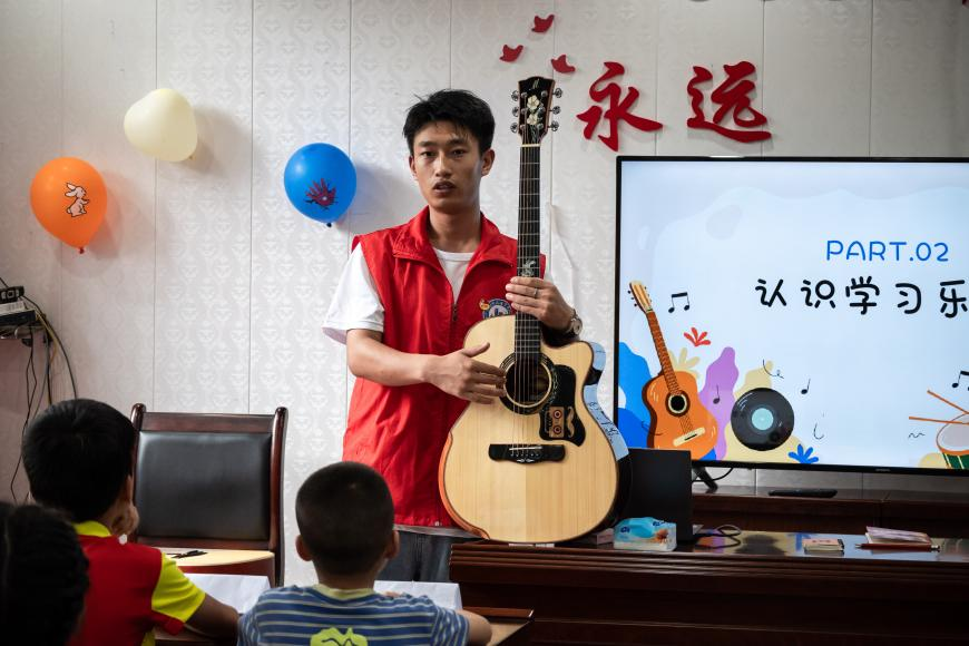 为了激发学生们对音乐的学习兴趣,在本次志愿服务活动中,志愿者将传统音乐课堂教学与吉他相结合,让学生们在学习音乐的同时,聆听旋律的美妙,感受到吉他的魅力。