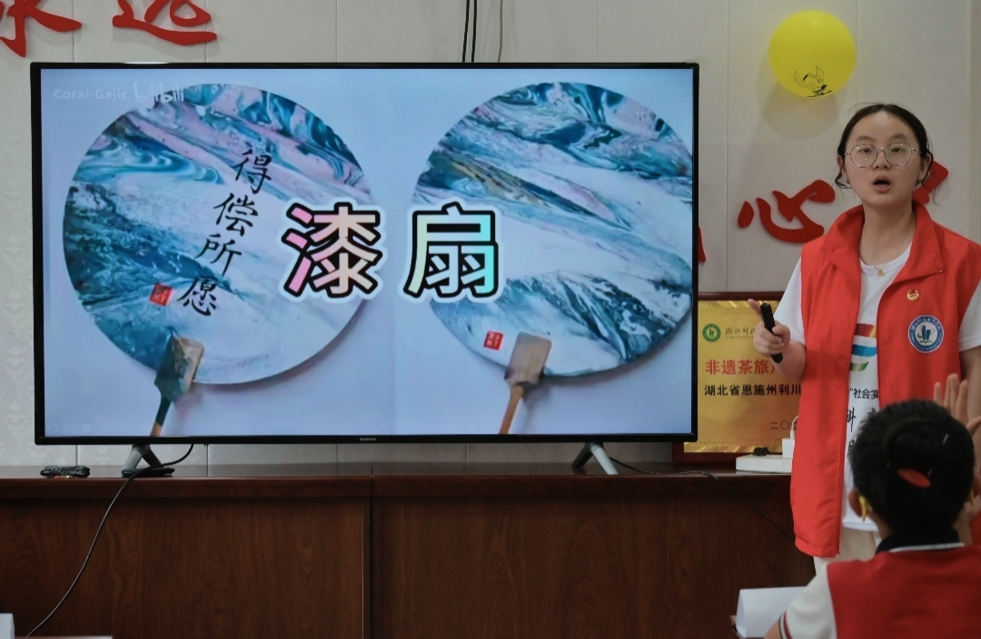 课程结束时,志愿者们举行了一个小型的展示会。学生们兴奋地展示着自己亲手制作的漆扇,脸上洋溢着喜悦与自豪。志愿者与学生们享受着非遗文化带来快乐的同时,也深深体味到非遗文化的博大精深与意蕴深厚。