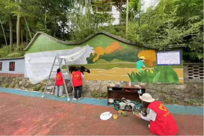 2023年7月,湖科学子再一次走进五二村开展了“艺术点‘靓’乡村,墙绘传递新风”的主题墙画绘制活动。同学们以茶园、五二新村桥、利川红茶、幸福石、民族大团结字样等为元素的墙画,勾画出幸福生活共同缔造的画面。