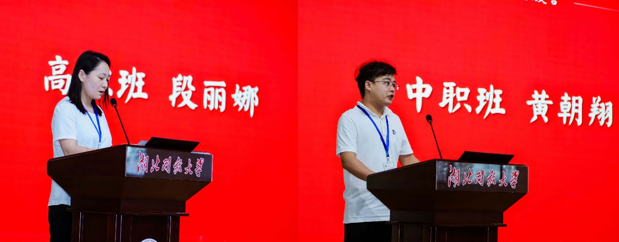 来自湖北城市建设职业技术学院的段丽娜老师和大冶市职业技术学校的黄朝翔老师,分别代表高职班和中职班学员发言。段丽娜表示看到课表后深感培训内容丰富、形式多样,期待接下来的学习。黄朝翔认为本次培训是一个充电、交流、提升的机会,希望能进一步提高自身综合素质和专业技能。参训的老师们表示将珍惜宝贵的学习机会,严格遵守培训纪律,相互学习共同提高。