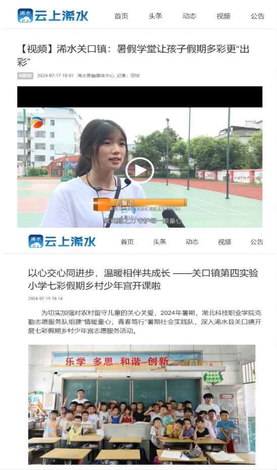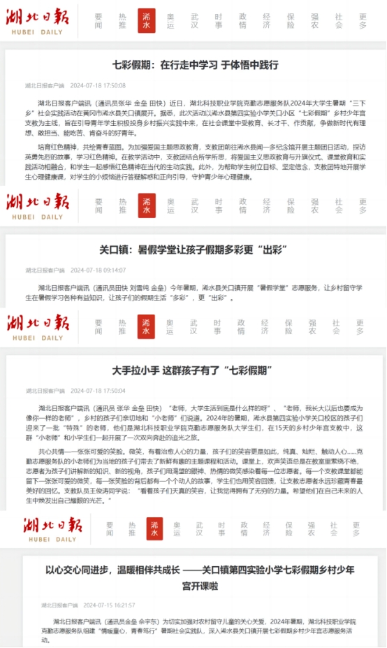 7月中上旬,根据团中央、省团委有关部署安排,为帮助乡村留守学生过一个快乐有意义的暑假,我校克勤志愿服务队围绕“七彩假期”主题,深入浠水县第四实验小学关口校区开展为期15天的乡村志愿服务。团队成员在带队老师指导下,顶住高温酷暑,克服诸多不便,精心设计教案,为孩子们带去了少儿编程、美术绘画、工业机器人等精品课程,让孩子的假期多彩更“出彩”,深受所在小学和130多名孩子的欢迎,得到湖北日报以及当地融媒体关注和持续报道,既彰显了我校学子倾心施爱、甘于奉献的青春风采,又提升了湖北科技职业学院的美誉度和影响力。